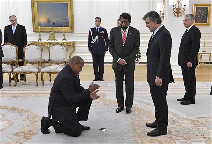 Fiji Cumhuriyeti Büyükelçisi Nair, güven mektubunu takdim ettikten sonra Gül'e, Başkatip Emosi Rakai'yi tanıttı. Rakai, Cumhurbaşkanı Gül ile tokalaşmasının ardından diz çökerek üç defa el çırptı. "Vaka cobo cobo" adı verilen söz konusu hareketin devlet başkanlarına gösterilen saygı göstergesi olduğu öğrenildi.