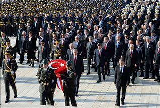 Cumhurbaşkanı Abdullah Gül başkanlığındaki devlet erkanı, Aslanlı Yol'dan yürüyerek Türkiye Cumhuriyeti'nin kurucusu Ulu Önder Mustafa Kemal Atatürk'ün mozolesinin bulunduğu bölüme geçti.