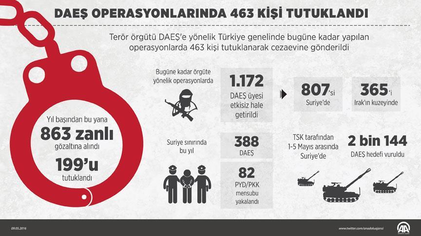 Yılbaşından beri DAEŞ'e yönelik operasyonlarda yakalanan 863 zanlıdan 199'u tutuklandı. Mayıs ayının başından bu yana gerçekleştirilen operasyonlarda da gözaltına alınan 43 şüpheliden 9'u cezaevine gönderildi.