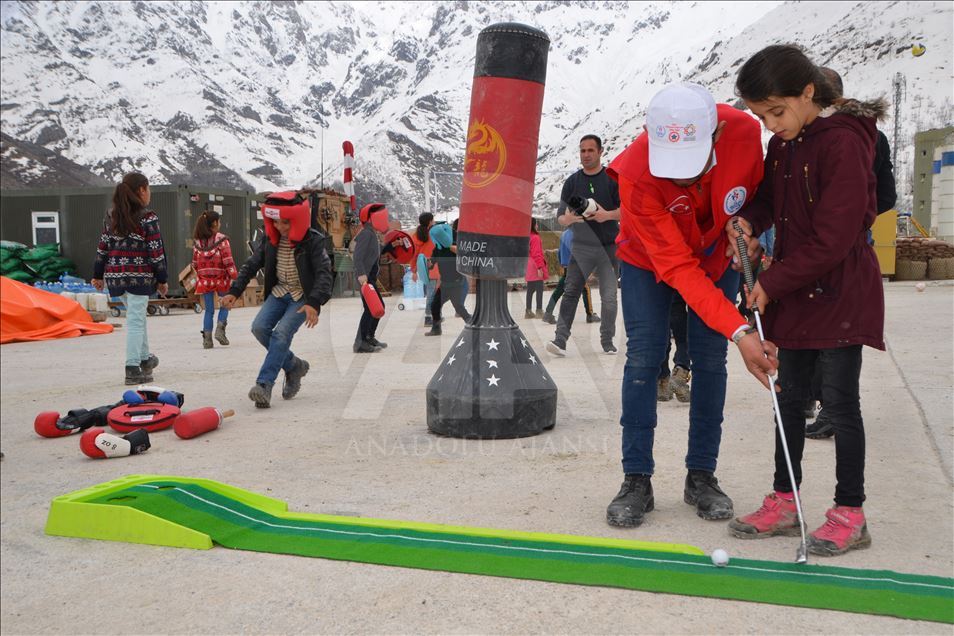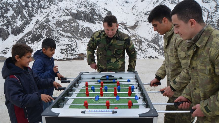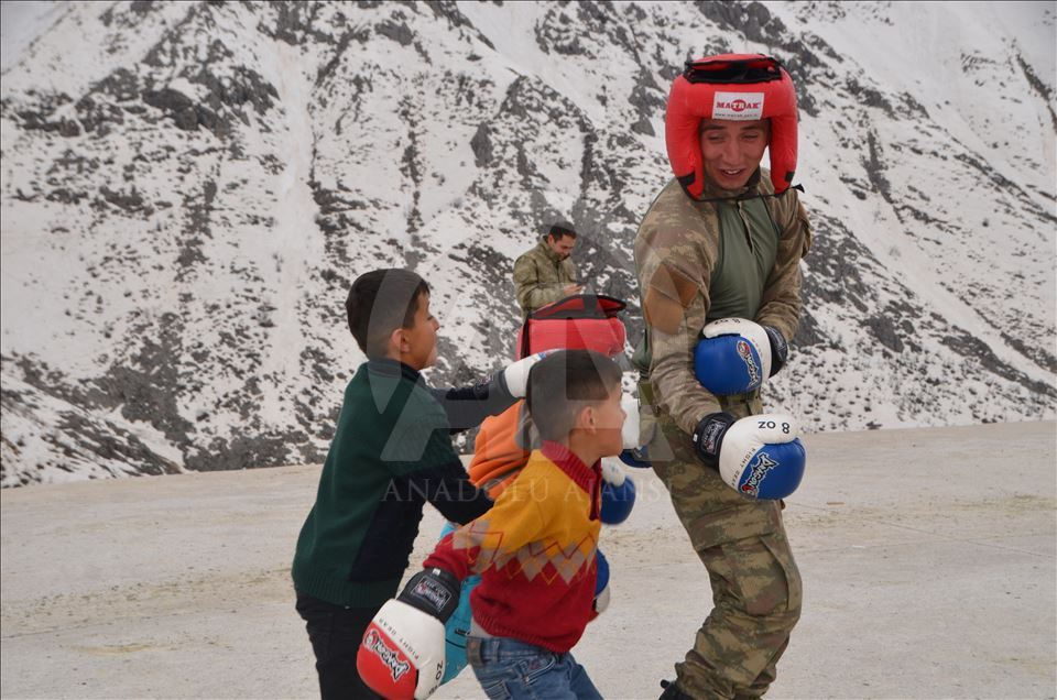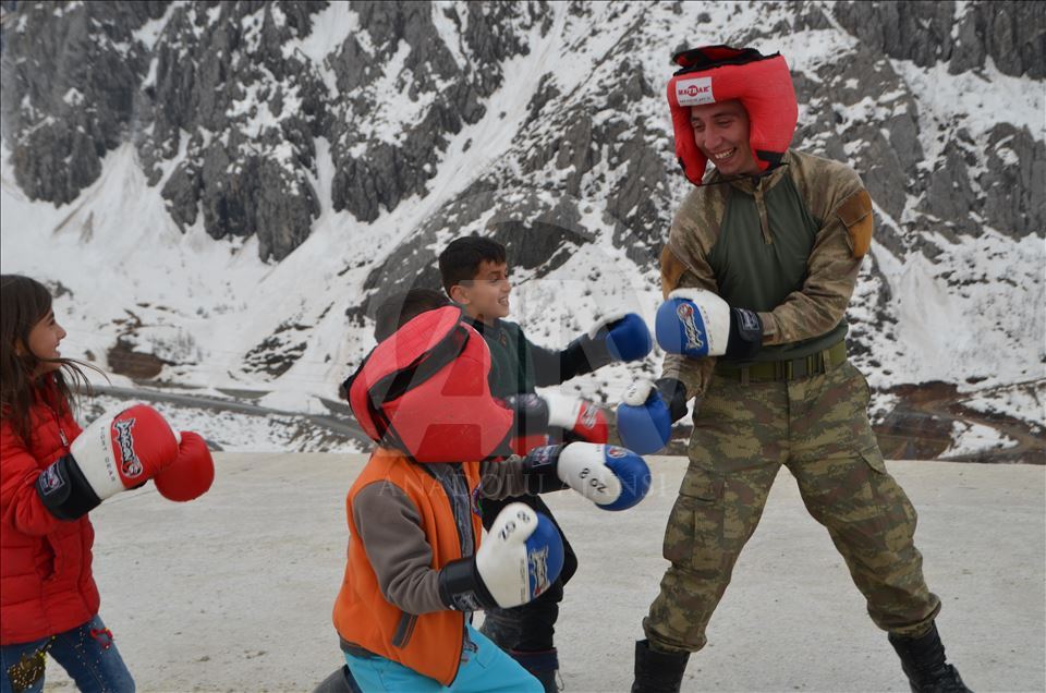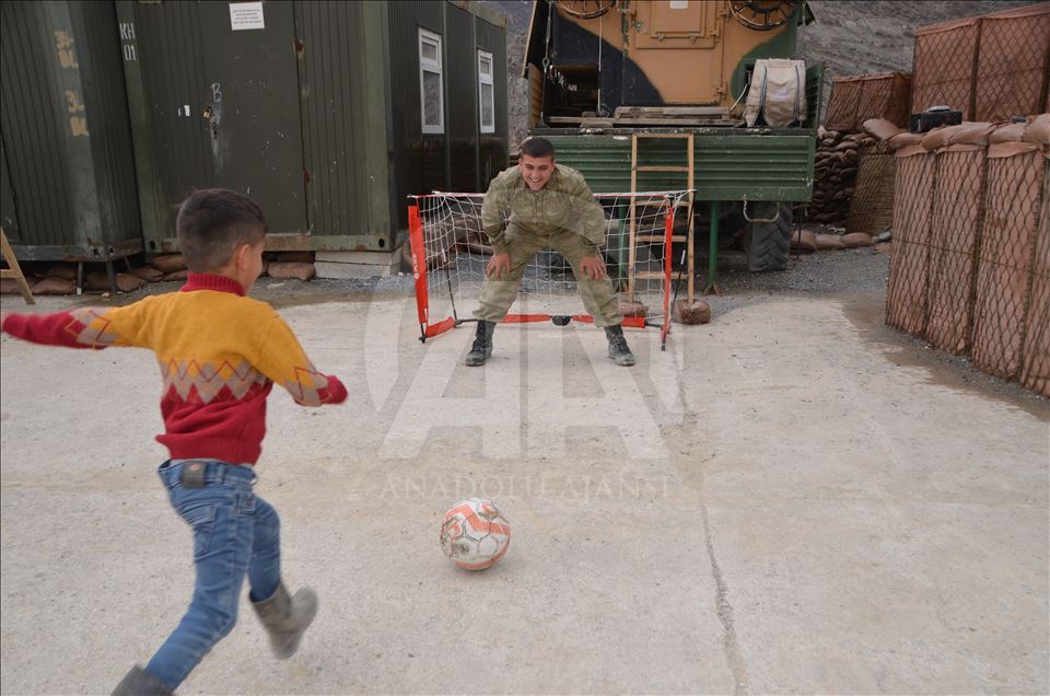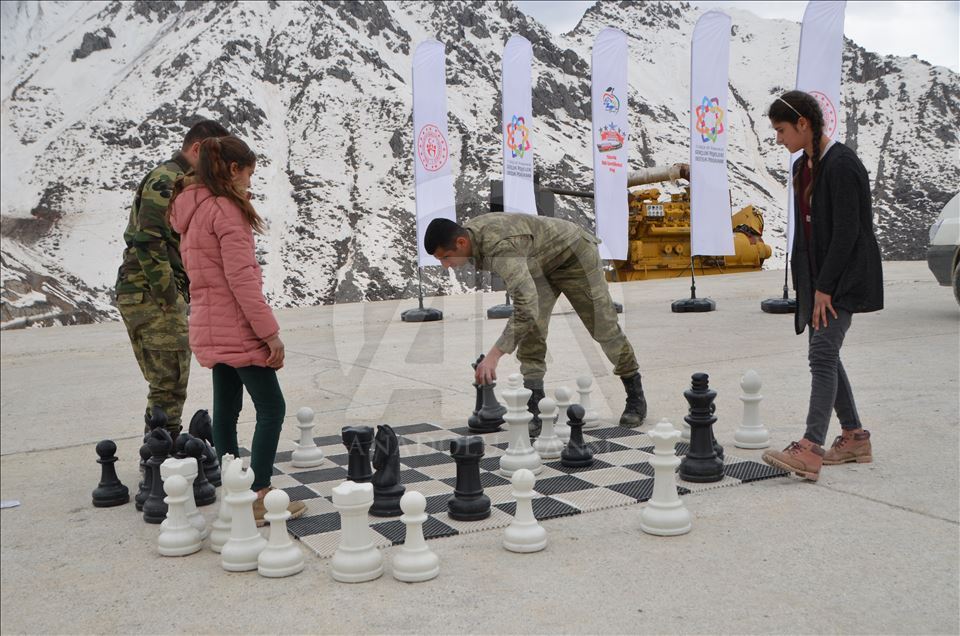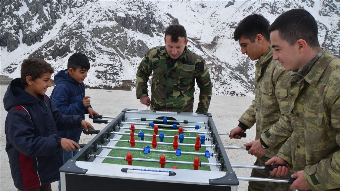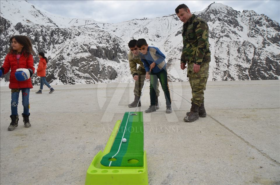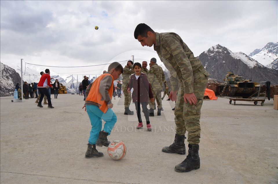 Hakkari'nin Yüksekova ilçesinde bir köy okulundaki öğrenciler, "Mobil Gençlik Merkezi" projesi kapsamında Dağlıca Hudut Taburu'ndaki helikopter pistinde askerlerin de katılımıyla spor yapıp oyunlar oynadı. ( Ulaş Güven - Anadolu Ajansı )