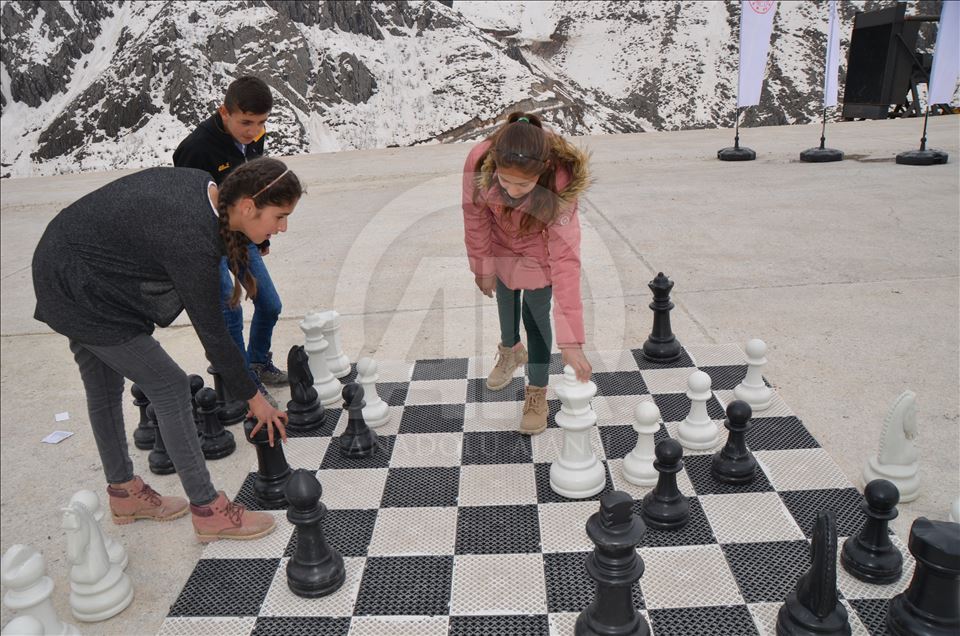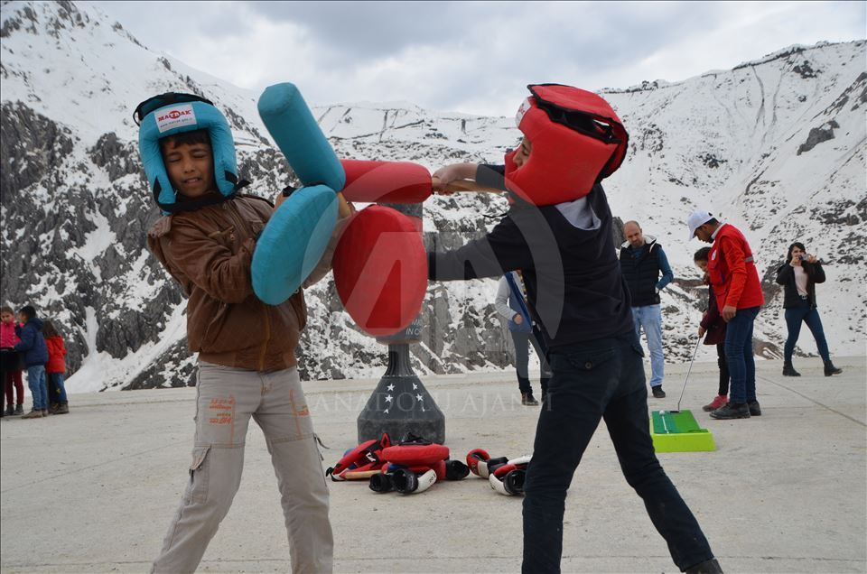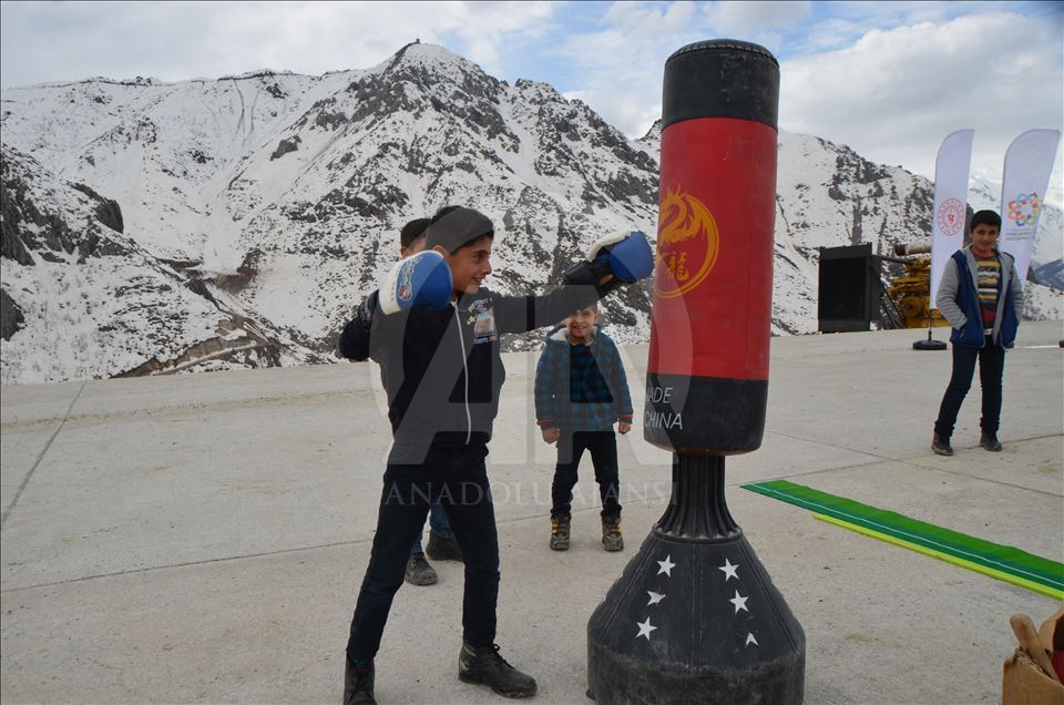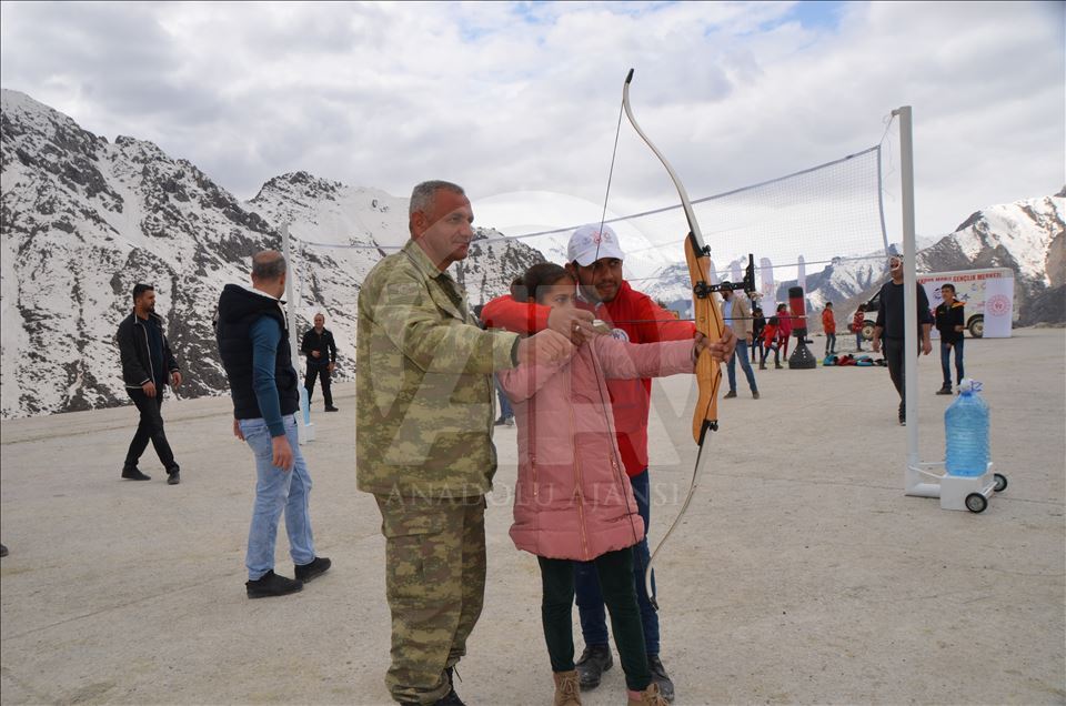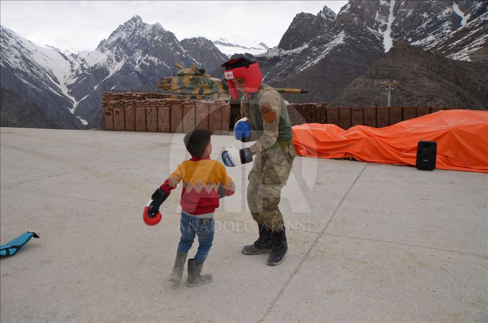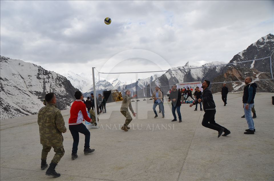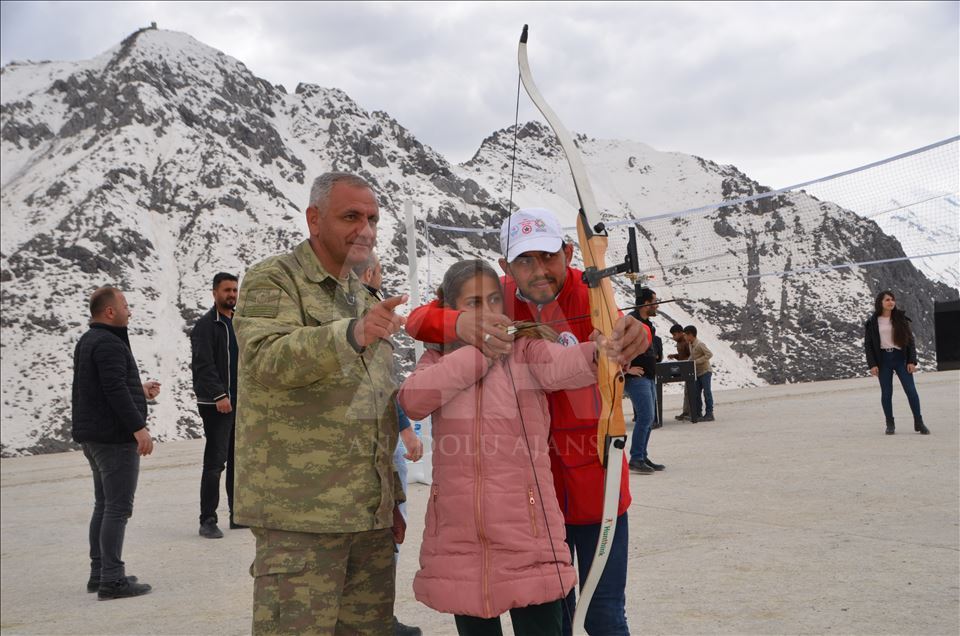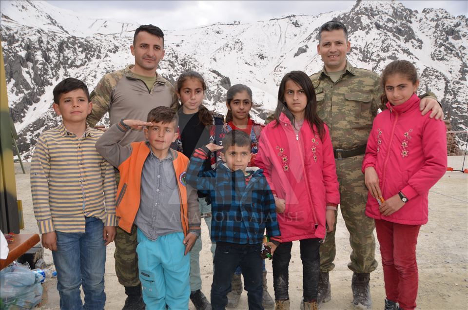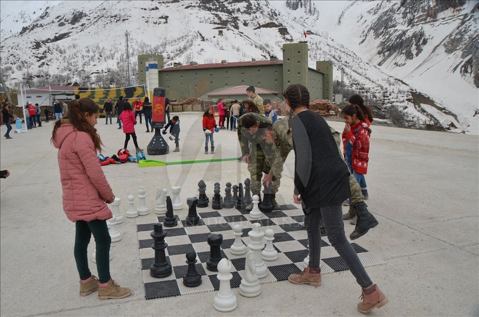 Görevliler, okulun bahçesi olmadığı için etkinliklerini bin 500 rakımlı Dağlıca Hudut Taburundaki helikopter pistinde gerçekleştirdi.