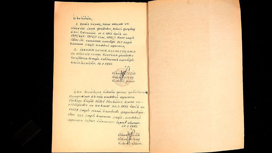 Pera Mezat Müzayedecilik tarafından Deniz Gezmiş, Yusuf Aslan ve Hüseyin İnan'ın kesinleşmiş idam hükmünün ıslak imzalı orijinal evrakı, internetten de online takip edilen müzayedede 5 lira açılış fiyatından satışa sunuldu.