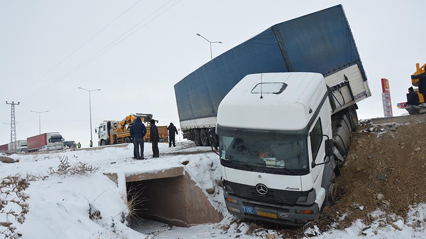 Ağrı'dan İran istikametine giden ve sürücüsünün ismi henüz öğrenilemeyen İran plakalı tır, Doğubayazıt Yaşar Eryılmaz Devlet Hastanesi kavşağında yoldan çıkarak menfeze devrildi.