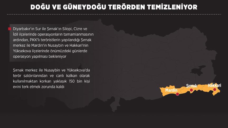Sur, Silopi, Cizre ve İdil'de yürütülen operasyonların son bulmasıyla PKK'lı teröristlerin yapılandığı Şırnak merkez ile Mardin'in Nusaybin ve Hakkari'nin Yüksekova ilçelerinde önümüzdeki günlerde güvenlik güçlerince operasyon yapılması bekleniyor.