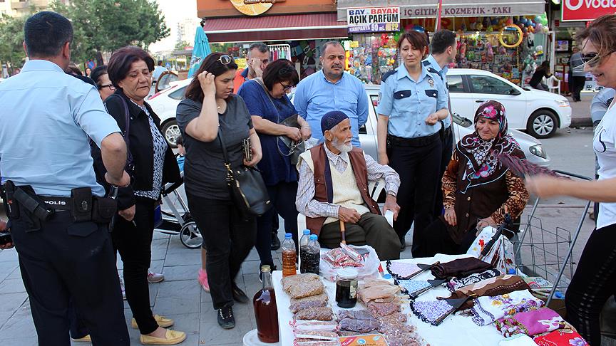Hanım Samur, AA muhabirine yaptığı açıklamada, eşiyle seyyar tezgahta satış yaparak geçinmeye çalıştığını, felçli olan oğlu ve 3 torununun rızkını kazandıklarını söyledi.