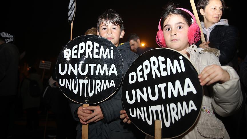 Ellerinde fenerler ile ''Depremi unutmadık, unutturmayacağız'' yazan dövizler taşıyan Düzce Depremzedeler Derneği (DEPDER) üyeleri ile vatandaşlardan oluşan grup, Atatürk Anıtı'na kadar yürüdü.