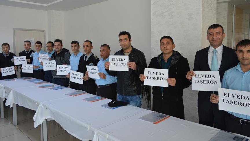 Kurumda çalışan personel, taşıdıkları "elveda taşeron" yazılı dövizler ile törene katıldı. Başvurularını gerçekleştiren personel, kadrolu işçi statüsüne geçecek olmanın sevincini bu dövizleri yırtarak kutladı.