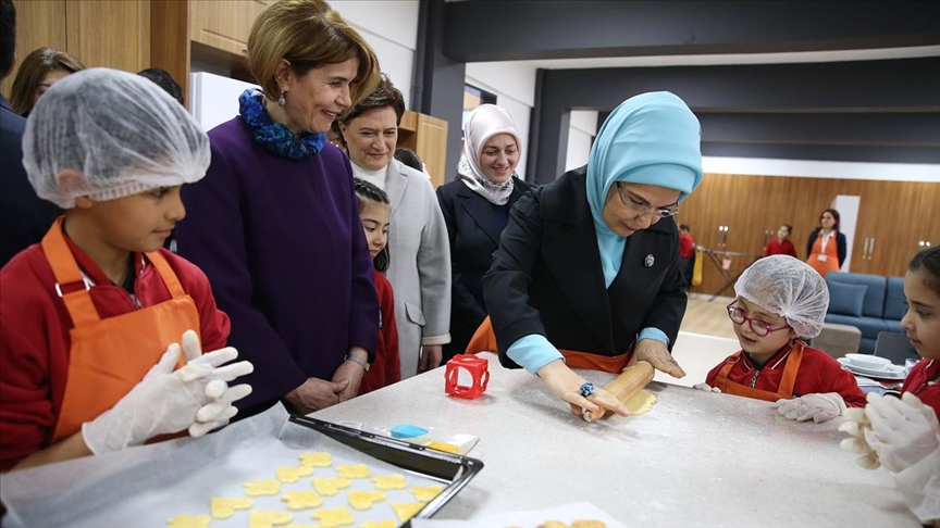 Emine Erdoğan, yaşam becerileri konulu atölye de öğrencilerle merdaneyle hamur açarak, glutensiz kurabiye yaptı. Pişirilen kurabiyelerin tadına bakan Emine Erdoğan, beğenisini 1,5 yaşındaki torununun yaptığı el işaretiyle gösterdi.