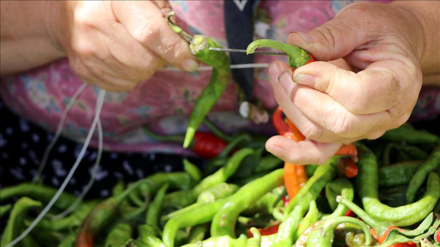 Ev hanımı 59 yaşındaki Hediye Yaşar, Karaağaç biberinin çokça tüketildiğini belirterek, "Bu işi severek yapıyoruz. Toplayıcılar buraya kamyonetle çuvallarla biber getiriyor, biz de biberleri severek ipe diziyoruz. Sabırlı ve özenli bir iş." dedi.