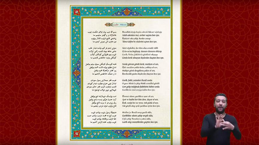 Faaliyetler çerçevesinde Türkçe'nin ilk yazılı eserlerinden Ahmet Yesevi'nin Divan-ı Hikmet'inin, görme engelliler için sesli betimlemeli olarak okutulduğunu, işitme engelliler için de işaret dilli olarak anlatıldığını belirten Yıldız, "Hoca Ahmet Yesevi bizim Türklüğümüzü, Müslümanlığımızı borçlu olduğumuz büyüğümüz. Bugün Anadolu'da, Balkanlar'da İslam, Müslümanlık ve Türklük varsa bu Hoca Ahmet Yesevi sayesindedir. Arzu ettik ki gönül gözüyle gören, can kulağıyla işiten kardeşlerimiz de bu değerli büyüğümüzün birlik, beraberlik, kardeşlik, dostluk gibi çok önemli mesajlarından istifade etsinler." diye konuştu.