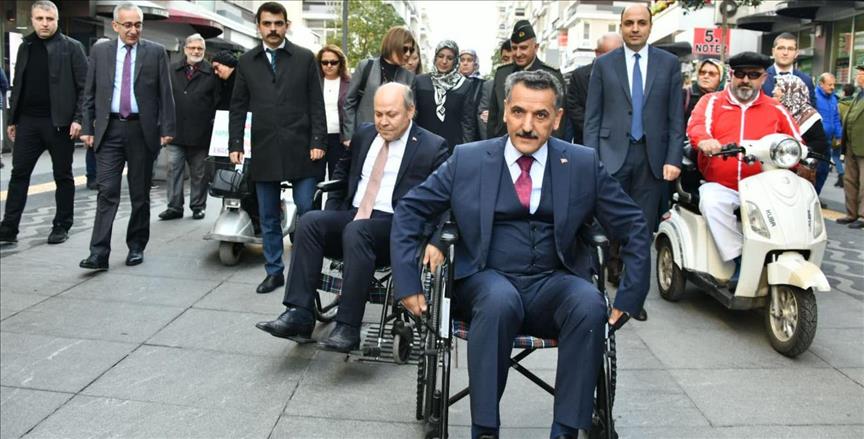 Samsun Valisi Osman Kaymak, 3 Aralık Dünya Engelliler Günü dolayısıyla düzenlenen yürüyüşte tekerlekli sandalye kullanarak engellilerin yaşadığı zorlukları anlamaya çalıştı.