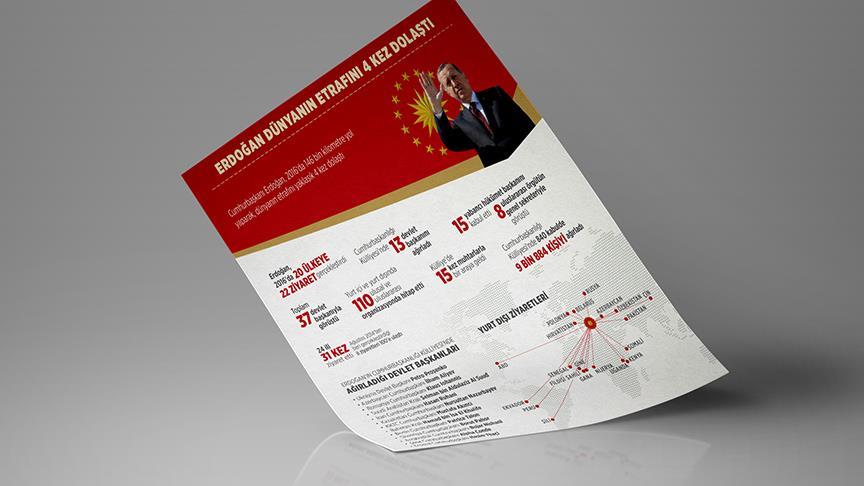 Cumhurbaşkanı Erdoğan, 2016'da 20 ülkeye, 22 ziyaret yaptı. Bu ziyaretler kapsamında Erdoğan, toplam 146 bin 704 kilometre yol yaparak, dünyanın etrafını yaklaşık 4 kez dolaştı.