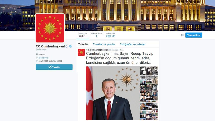 Cumhurbaşkanlığının sosyal paylaşım sitesi resmi Twitter hesabı "@tcbestepe" üzerinden, 26 Şubat 1954 tarihinde doğan Cumhurbaşkanı Erdoğan'ın doğum gününe özel tweetlere yer verildi.