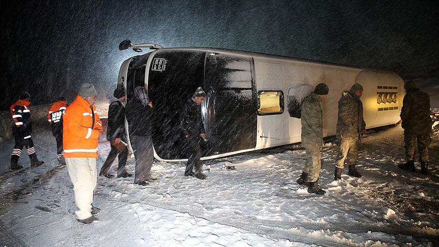 Ankara’dan Van’a giden, İbrahim Koç (43) yönetimindeki 33 BLN 33 plakalı yolcu otobüsü, kar yağışı ve tipinin etkili olduğu Erzincan-Erzurum karayolunun Sansa Deresi mevkisinde buzlanma nedeniyle kontrolden çıkarak yola devrildi.