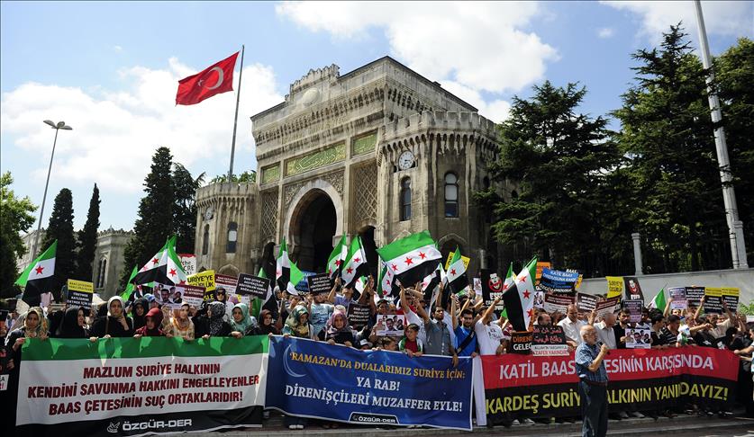 ÖZGÜR-DER öncülüğünde Beyazıt Meydanı'nda toplanan protestocu grup, ''Ramazanda Dualarımız Suriye İçin! Ya Rab Direnişçileri Muzaffer Eyle'' ve ''Katil Baas Çetesinin Karşısında, Kardeş Suriye Halkının Yanındayız'' pankartları açtı.