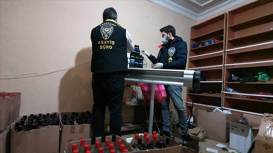 Kaçak imalathane olarak kullanılan dairede yapılan aramada, kullanıma hazır çok sayıda alkol şişesi, alkol yapımında kullanılan ürünler ve etil alkol ele geçirildi.