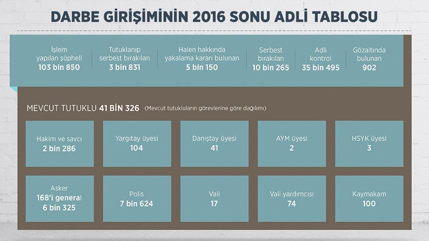 Tutuklananlar arasında 2 bin 286 adli ve idari yargıda görevli hakim ve savcı, 104 Yargıtay, 41 Danıştay, 2 Anayasa Mahkemesi, 3 Hakimler ve Savcılar Yüksek Kurulu (HSYK) üyesi, 168'i general olmak üzere 6 bin 325 asker, 7 bin 624 polis, 17 vali, 74 vali yardımcısı ve 100 kaymakam da bulunuyor.