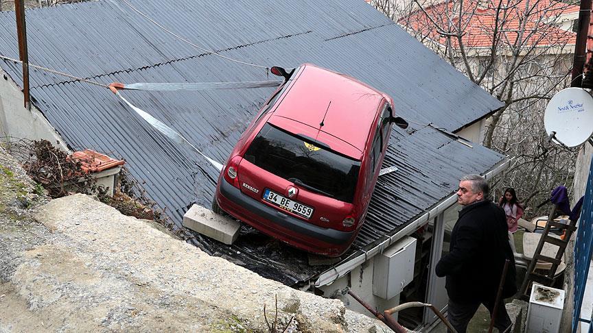 Beykoz'da aracını park etmek için manevra yapan sürücü, fren yerine gaza basınca yoldan çıkıp aşağıdaki gecekondunun çatısına düştü.