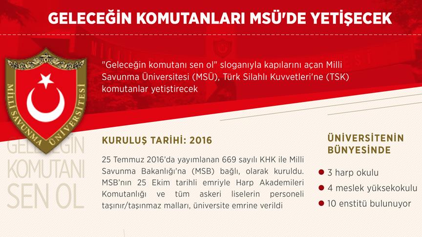 "Geleceğin komutanı sen ol" sloganıyla kapılarını açan, Başbakan Binali Yıldırım'ın katılacağı törenle de akademik yıl açılışı gerçekleştirilecek Milli Savunma Üniversitesi (MSÜ), Türk Silahlı Kuvvetleri'ne komutanlar yetiştirecek.