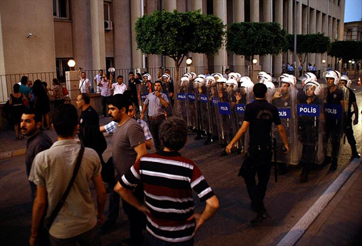 Bu arada, tutuklanan zanlılara destek vermek amacıyla adliye binası önünde toplanan grupla polis arasında kısa süreli arbede yaşandı. Polis, zanlıların içinde bulunduğu minibüsün önüne geçen gruba biber gazıyla müdahale etti. Bazı grup üyeleri polise taşla saldırdı, arbede sırasında bir kadın baygınlık geçirdi.