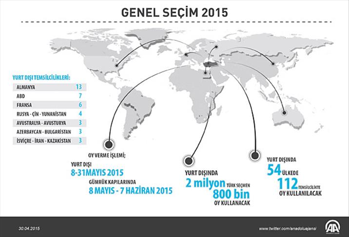 Yüksek Seçim Kurulu (YSK), 7 Haziran'da yapılacak 25. Dönem Milletvekili Genel Seçimi için 54 ülkedeki 112 temsilcilikte sandık kurdu. Yurtdışında yaşayan Türk seçmenler için oy verme işlemi yarın başlayacak ve 31 Mayıs'ta sona erecek.