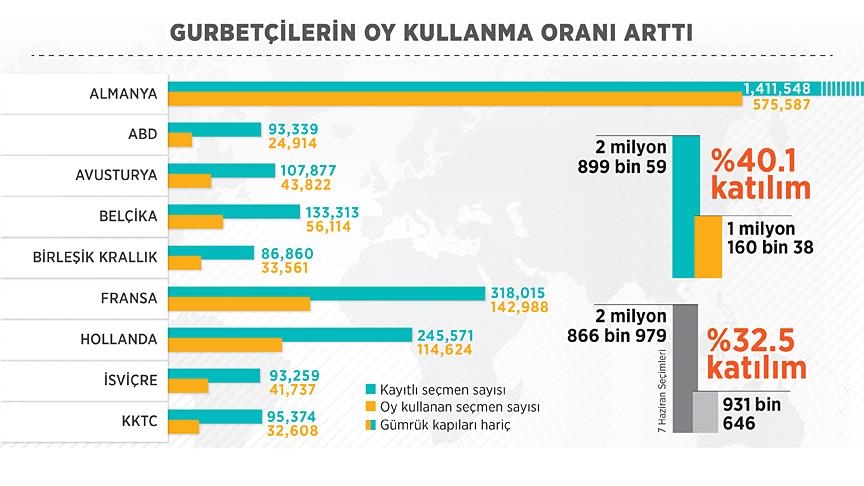 Böylece yurt dışı seçmen kütüğüne kayıtlı 2 milyon 899 bin 59 seçmenin 1 milyon 160 bin 38'i, dış temsilciliklerde oy kullandı.