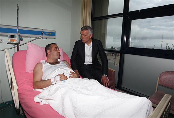 Trabzonspor Kulübü Başkanı İbrahim Hacıosmanoğlu, Fenerbahçe kafilesini taşıyan otobüse yapılan silahlı saldırıda yaralanan otobüs şoförü Ufuk Kıran'ı hastanede ziyaret etti.