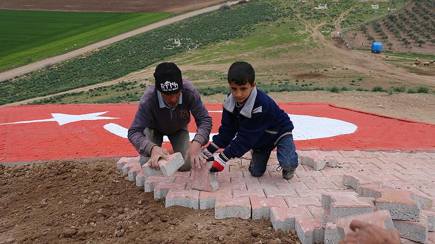 Hatay'ın Reyhanlı ilçesinde, Zeytin Dalı Harekatı'na destek olmak isteyen çoban Bekir Şanverdi, Afrin sınırındaki bir tepeye dizdiği taşları boyayarak 150 metrekarelik Türk bayrağı resmetti.