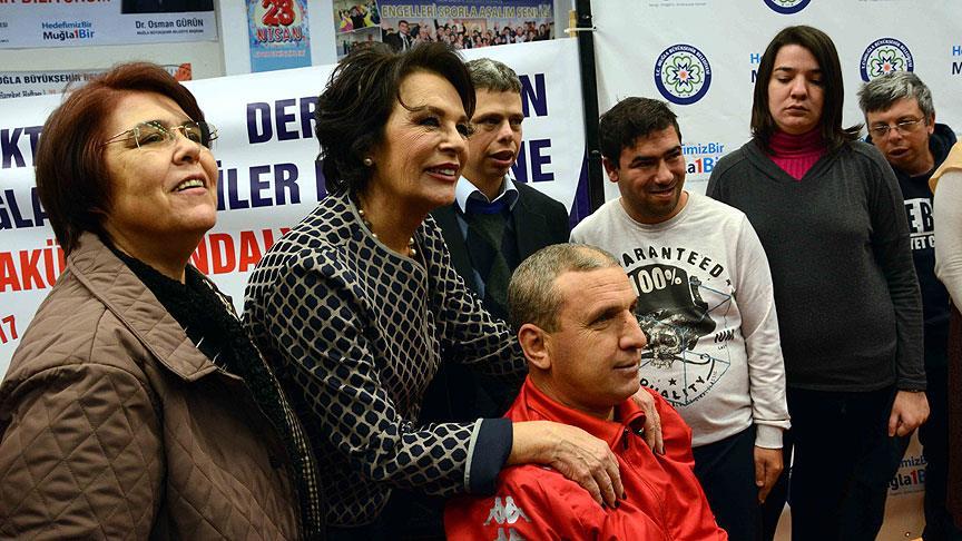 Muğla'nın Menteşe İlçesindeki Düğerek Spor Salonu'nda gerçekleşen akülü tekerlekli sandalye dağıtım törenine Vali Amir Çiçek, eşi Hülya Çiçek ve sanatçı Hülya Koçyiğit ile geldi. Koçyiğit ve Çiçek'i salonda karşılayan engellililer çiçek verip, fotoğraf çektirdi.