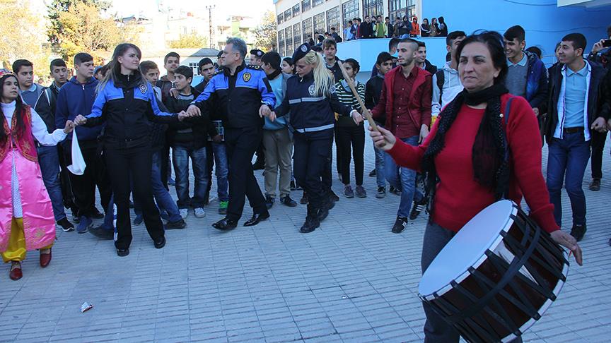 Okulun halk oyunu ekibinin gösterisini izleyen polisler, daha sonra öğrencilerle davul zurna eşliğinde halay çekti.