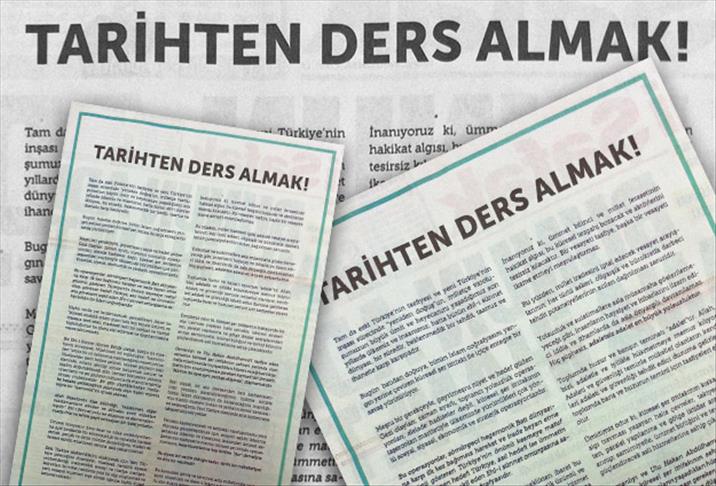 Bugün bazı gazetelerde tam sayfa halinde yer alan "Tarihten Ders Almak" başlıklı ilanda, şunlar kaydedildi: