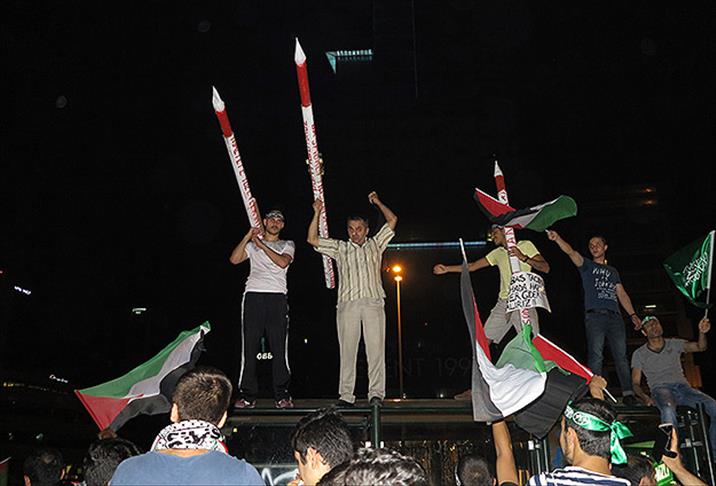 Başkonsolosluk binasının önündeki güvenlik bariyerlerine Türk ve Filistin bayrağı asan gruptakiler, sık sık tekbir getirdi. Eylemde, İzzeddin el-Kassam Tugayları'na ait temsili füze maketi de taşındı.