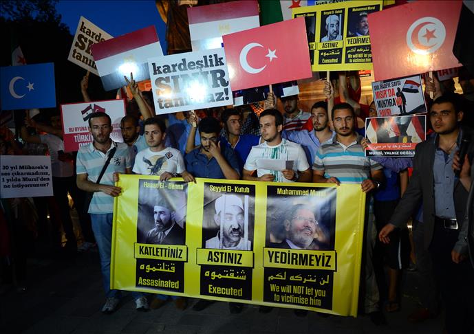 Ellerinde Türk, Mısır ve Filistin bayrakları taşıyan gruptakiler, Hasan El-Benna, Seyyid El-Kutub ve Muhammed Mursi'nin resimlerinin de bulunduğu "Katlettiniz, astınız, yedirmeyeceğiz", "Baharlarımızı kışa çevirmenize izin vermeyeceğiz", "Mısır'da darbeye hayır", "Kardeşlik sınır tanımaz" yazılı pankartlar açtı.