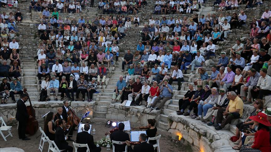 Kruvaziyerle Aydın'ın Kuşadası ilçesindeki limana gelen yabancı turistler için Selçuk ilçesindeki Efes Antik Kenti'nde klasik müzik dinletisi gerçekleştirildi.