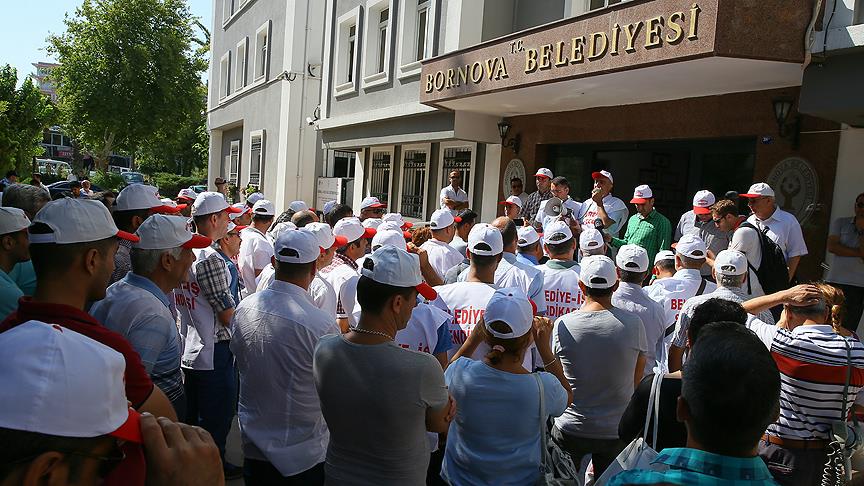 Toplu İş Sözleşmesi görüşmelerindeki uyuşmazlık dolayısıyla alınan grev kararıyla 56 işçi Bornova Belediyesi önünde bir araya geldi.
