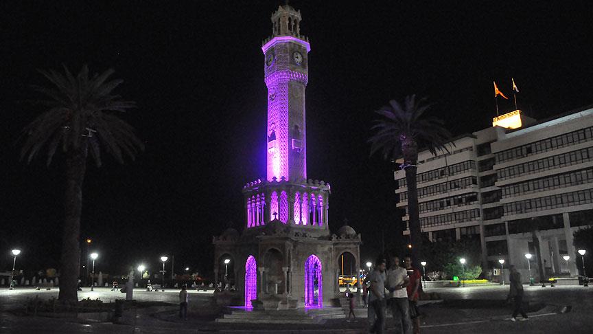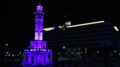 Konak Meydanı'nda yer alan İzmir Saat Kulesi, "21 Eylül Dünya Alzaymır Günü" dolayısıyla İzmir Büyükşehir Belediyesi tarafından morla ışıklandırıldı. Gün nedeniyle Geriatri Bilimleri Derneği üyeleri, ellerinde pankart, boyunlarında mor fularla düdük çalarak alana geldi.