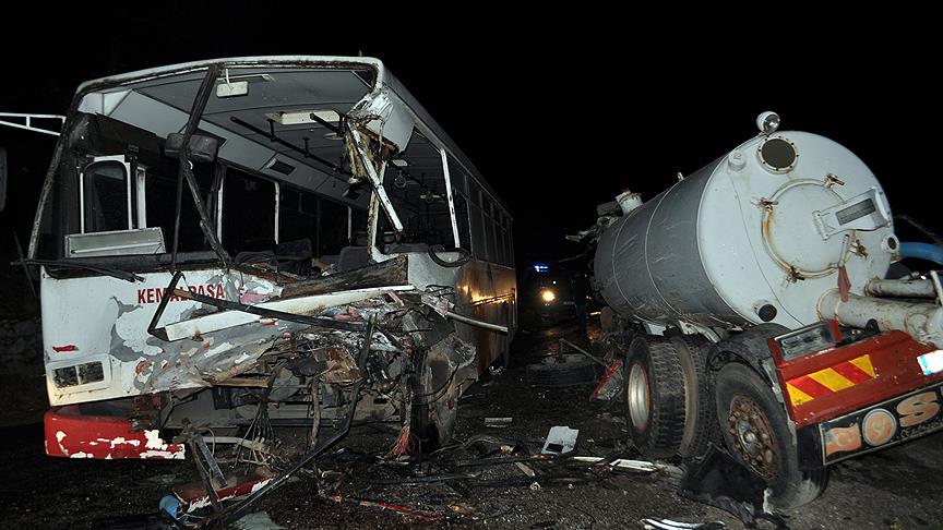Alınan bilgiye göre, Kemalpaşa Belediyesinde çalışan işçileri taşıyan Ahmet Ar yönetimindeki 35 EDN 04 plakalı servis otobüsü, eski İzmir yolunun 21. kilometresindeki Armutlu Mahallesi mevkisinde karşıdan gelen Mehmet Şimşek idaresindeki 35 PDU 84 plakalı tankerle çarpıştı.