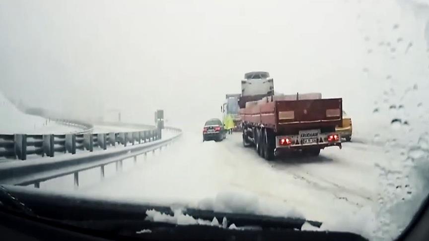 Videoda, kış lastiği bulunmayan araçların kaza yaptıkları, kış lastiği takılı araçların ise yolda daha güvenli ilerledikleri görüldü.