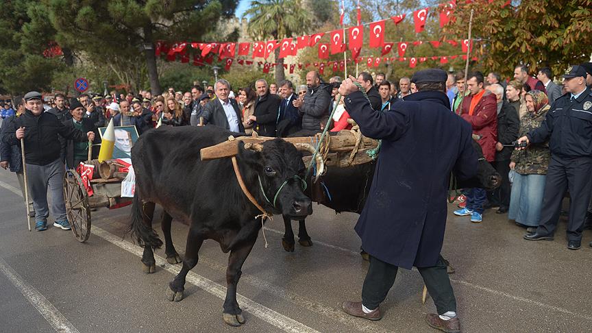 Tören alanına iki öküzün çektiği kağnıyla gelen esnaf Gökhan Caner, tören geçişine de katıldı.