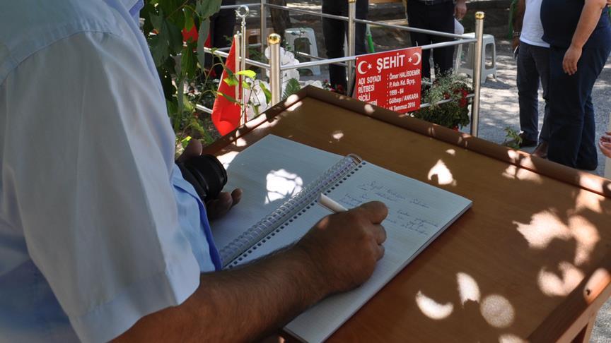 FETÖ'nün 15 Temmuz'daki darbe girişimi sırasında, Ankara'da Özel Kuvvetler Komutanlığında darbeci generali vurduktan sonra şehit olan Piyade Astsubay Kıdemli Başçavuş Ömer Halisdemir'in Niğde'deki kabrini ziyarete gelenler, duygularını anı defterine de yazıyor.