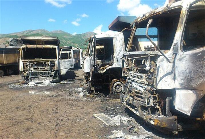 Burada bir iş makinesi ve 3 kamyonuna benzin döküp ateşe veren teröristler, karanlıktan yararlanarak şantiye alanından kaçtı.