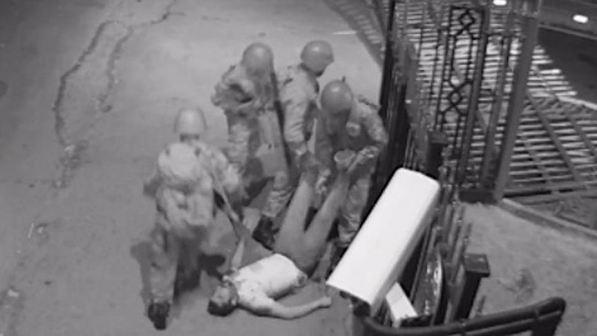 Zorlukla ayağa kalkarak, yürümeye çalışan bir başka yaralıya darbecinin müdahalesi de kamera kayıtlarında yer alıyor.