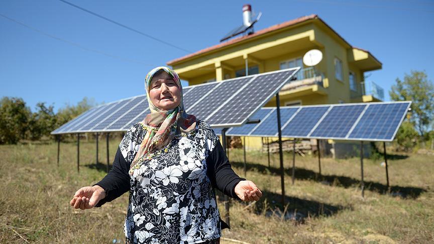 Sinop'ta Kezban Karaman (52), yakınlarını ziyaret için gittiği Almanya'da bir evin bahçesinde gördüğü güneş panellerini köyündeki evinin bahçesine kurdurarak kullandığı elektriği karşılıyor.