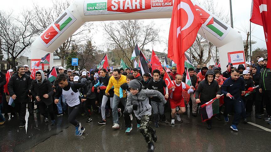 15 Temmuz Şehitler Çeşmesi önünden başlayan halk koşusu, 15 Temmuz Şehitler Makamı'nda sona erdi. Koşuya katılanlar ellerinde Türk ve Filistin bayrakları ve Mehmed Akif'in Ersoy'un, "Asım'ın nesli diyordum ya nesilmiş gerçek/,İşte çiğnetmedi namusunu çiğnetmeyecek", beyti ile "İsrail bir terör devletidir, inadına Kudüs", "Üzülme çünkü Allah bizimledir", yazılı dövizler taşıdı.