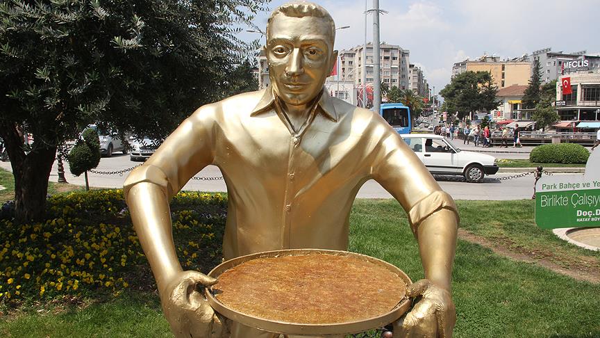 Birleşmiş Milletler Eğitim, Bilim ve Kültür Örgütünce (UNESCO), gastronomi alanında Yaratıcı Şehirler Ağı'na layık görülen Hatay'da tanıtım için yapılan "künefe çeviren adam" heykelinin çalındıktan sonra bulunan bakır tepsisinin yerine, demir tepsi monte edildi.