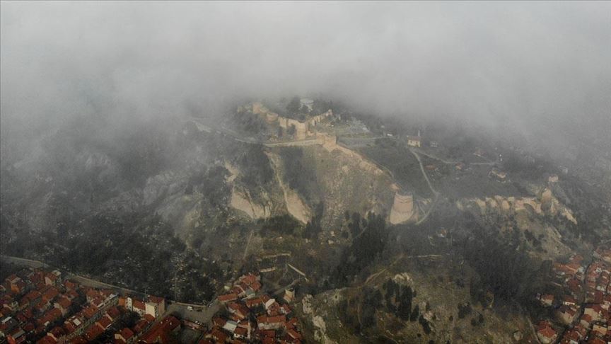 Tarihi Kütahya Kalesi de sis bulutu altında kaldı.