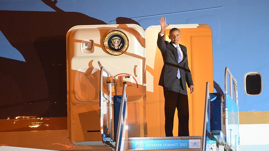 G20 Liderler Zirvesi'ne katılan ABD Başkanı Obama, konakladığı Belek Turizm Bölgesi'ndeki otelinden Antalya Havalimanı'na geçti. ABD Başkanı Obama, ABD Başkanlık uçağı "Air Force One" ile Antalya Havalimanı'ndan ayrıldı.