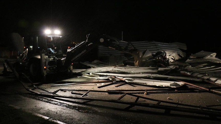 Manisa'da gece yarısından sonra etkili olan fırtınada kentteki çok sayıda binanın çatısı uçtu, aydınlatma direkleri ve ağaçlar yollara devrildi, araçlarda hasar oluştu. Kent merkezinde etkili olan fırtına nedeniyle enerji iletim hatlarının kopması ve bazı trafolarda yaşanan arızalar sonucu kentin önemli bölümünden elektrik kesintisi yaşandı. ( Ahmet Bayram - Anadolu Ajansı )