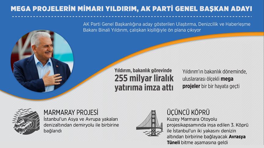 AK Parti'de Başbakan Ahmet Davutoğlu'nun görevi bırakma kararından sonra genel başkanlığa aday gösterilen Ulaştırma, Denizcilik ve Haberleşme Bakanı Binali Yıldırım, 11 yılı aşan bakanlık görevinde çalışkan ve başarılı bir isim olarak öne çıktı.