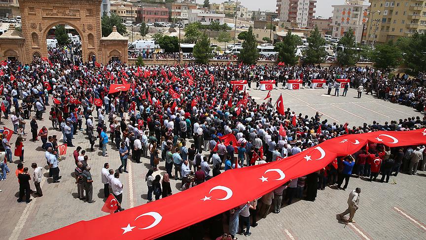 Ellerinde Türk bayraklarıyla törene katılan binlerce kişi, "Şehitler ölmez, vatan bölünmez", "Kahrolsun PKK", "Meclis'te PKK istemiyoruz" ve "Hepimiz polisiz, hepimiz asker" sloganları attı.